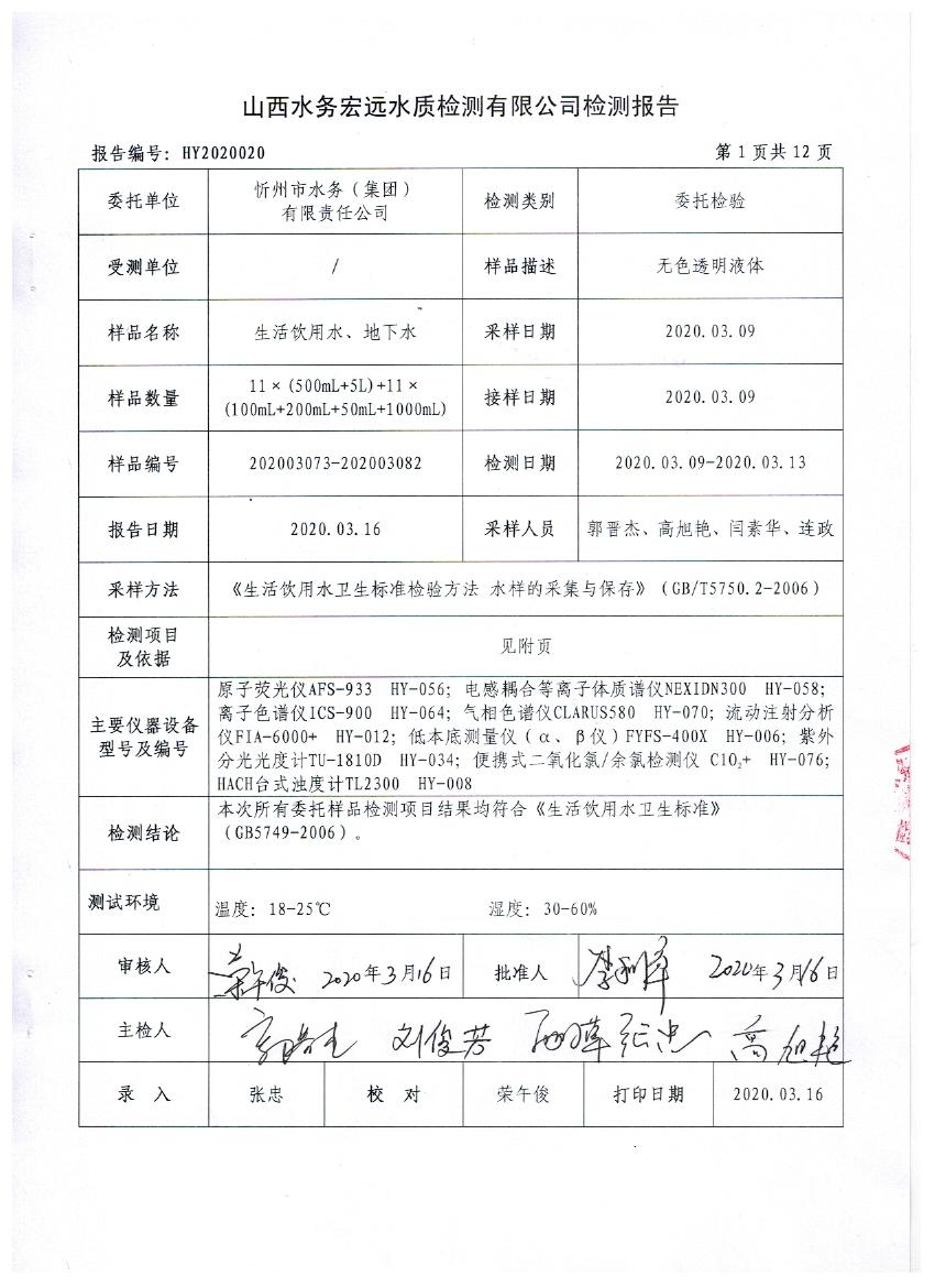忻州城區(qū)公共供水水源水、出廠水、管網(wǎng)水、管網(wǎng)末梢水2020年3月份水質信息公示