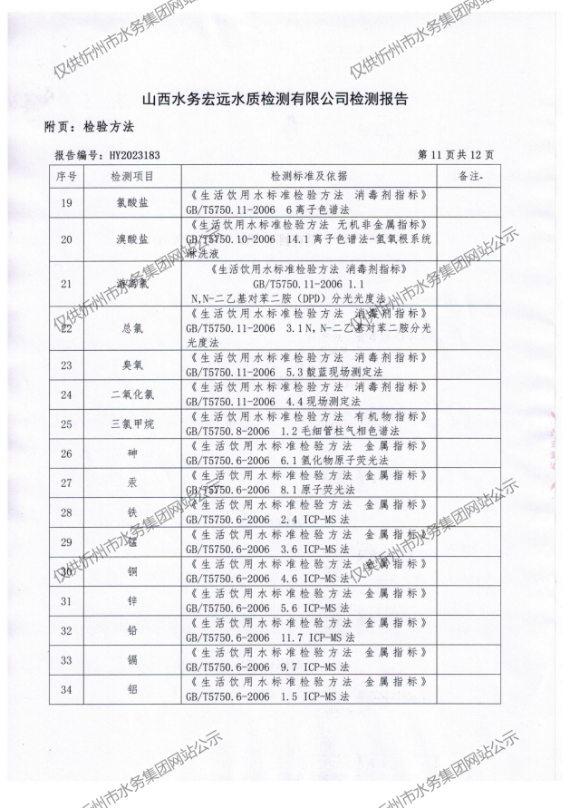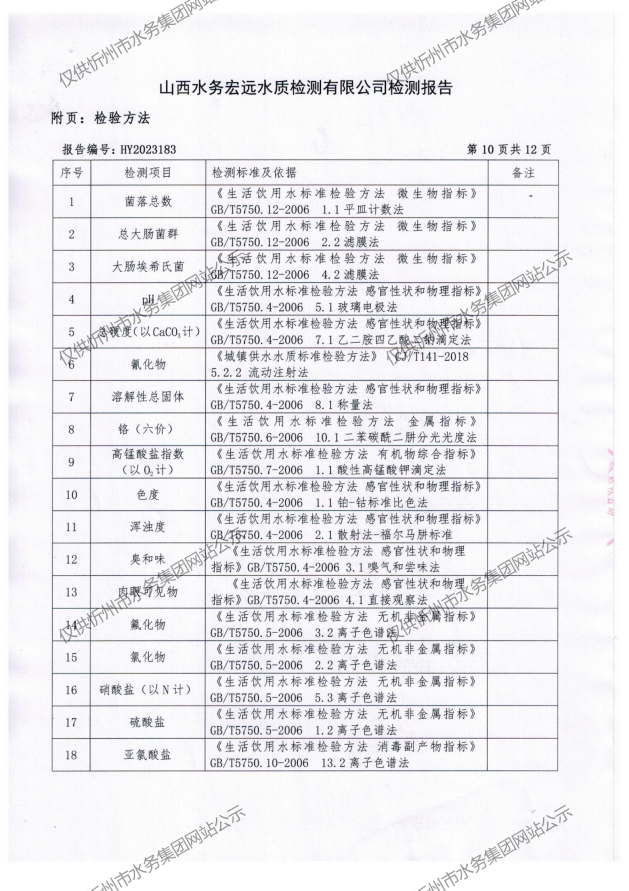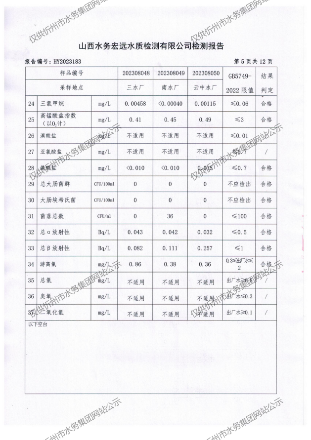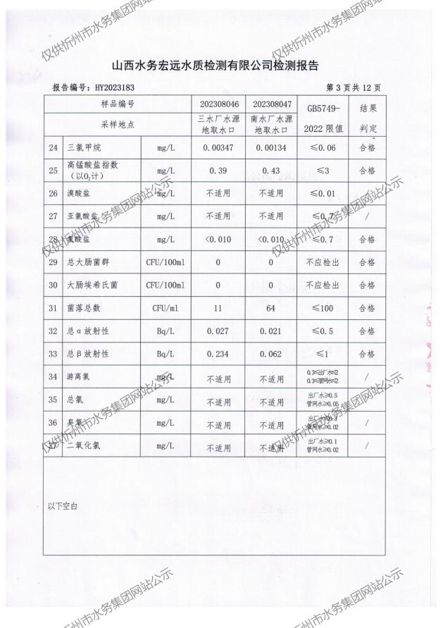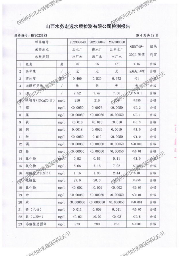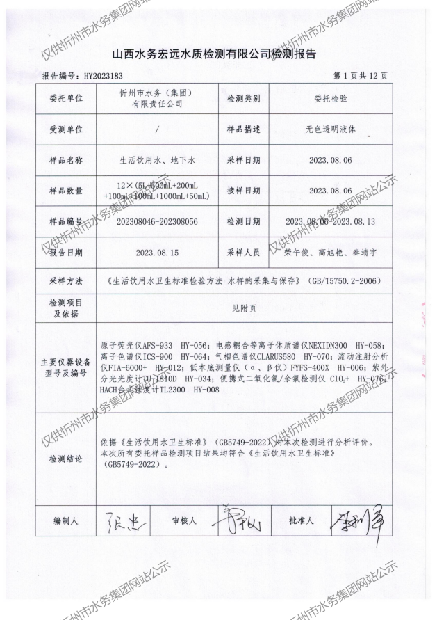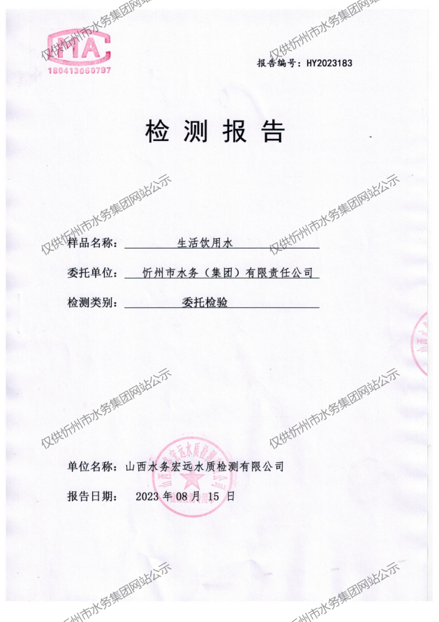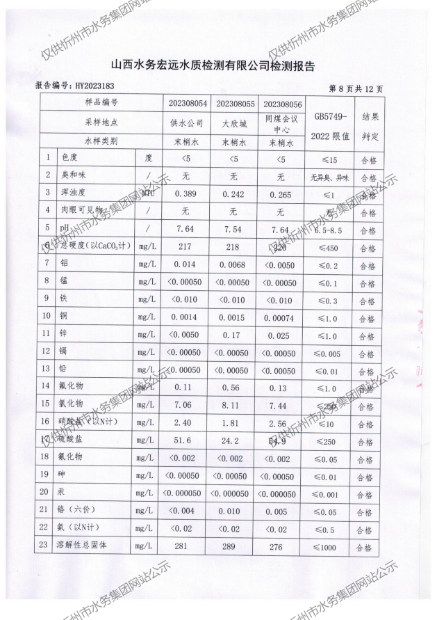 忻州城區(qū)公共供水水源水、出廠水、管網水、管網末梢水2023年8月份水質信息公示